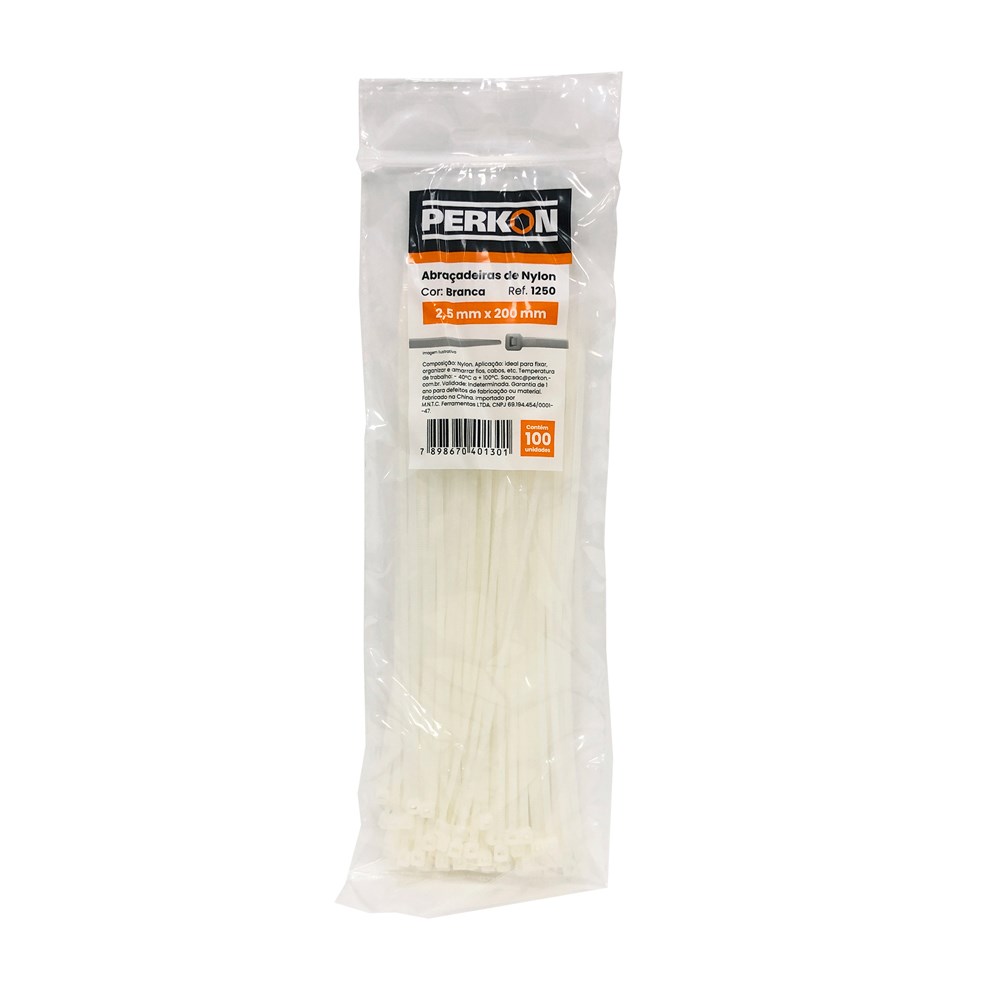 Abraçadeira Nylon Perkon - Branca 2,5x200 100 Peças