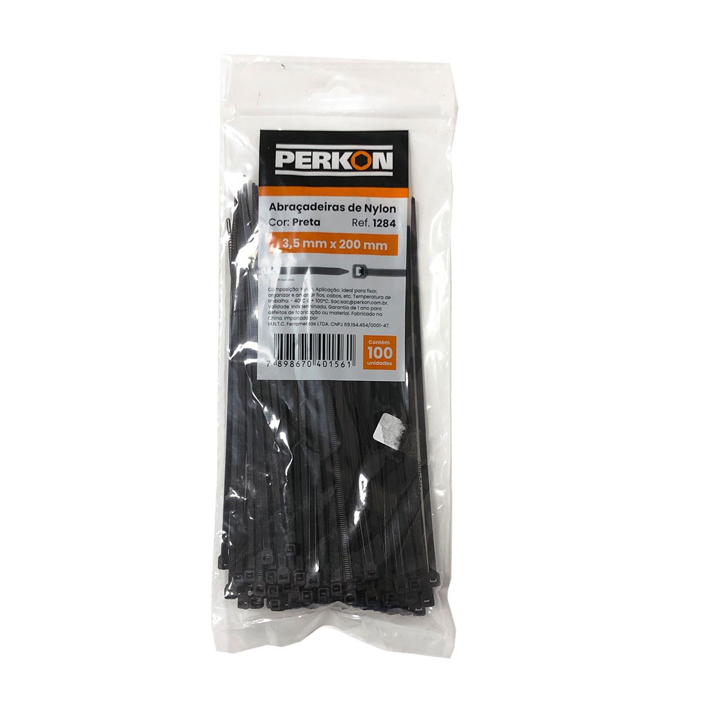 Abraçadeira Nylon Perkon - Preta 3,5x200 100 Peças - 1284