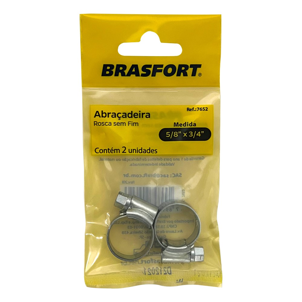 Com a Cartela Abraçadeira Brasfort - Rosca Sem Fim (B) 5/8 x 3/4" com 2 Peças - 7652, você terá a confiança de que suas conexões estarão seguras e eficientes, permitindo que você se concentre no que realmente importa: a qualidade do seu trabalho.