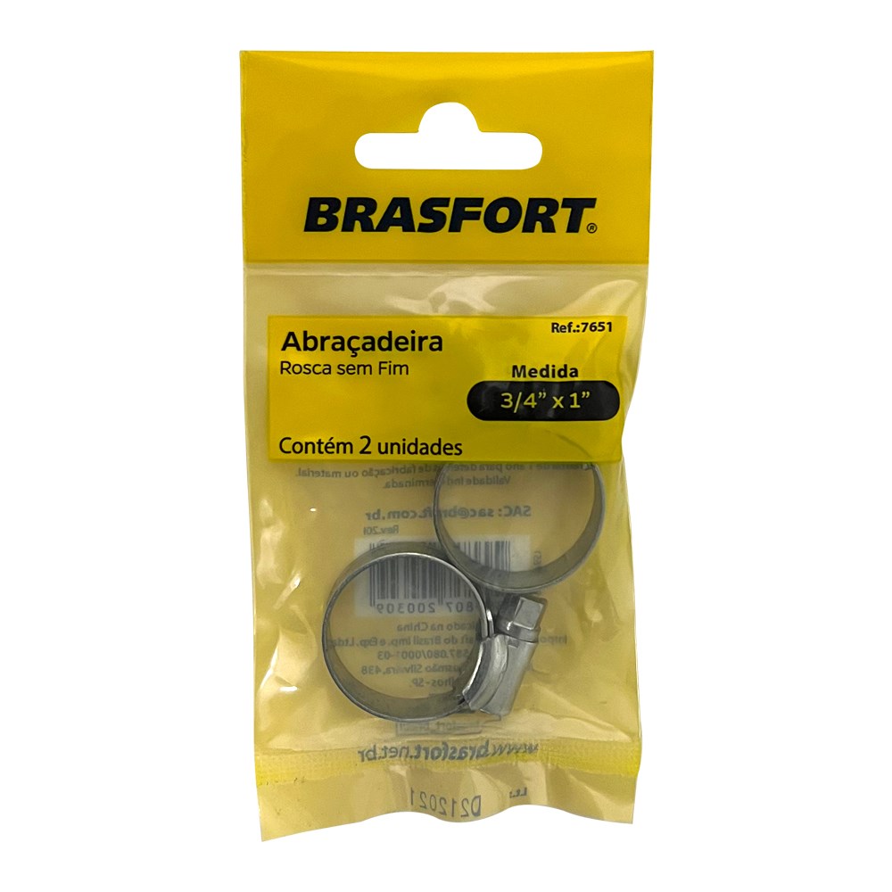 A Cartela Abraçadeira Brasfort - Rosca Sem Fim (C) 3/4 X 1" com 2 Peças - 7651 é a escolha perfeita para quem busca qualidade e eficiência em suas instalações. Não deixe de garantir a segurança e a funcionalidade dos seus sistemas com este produto confiável.