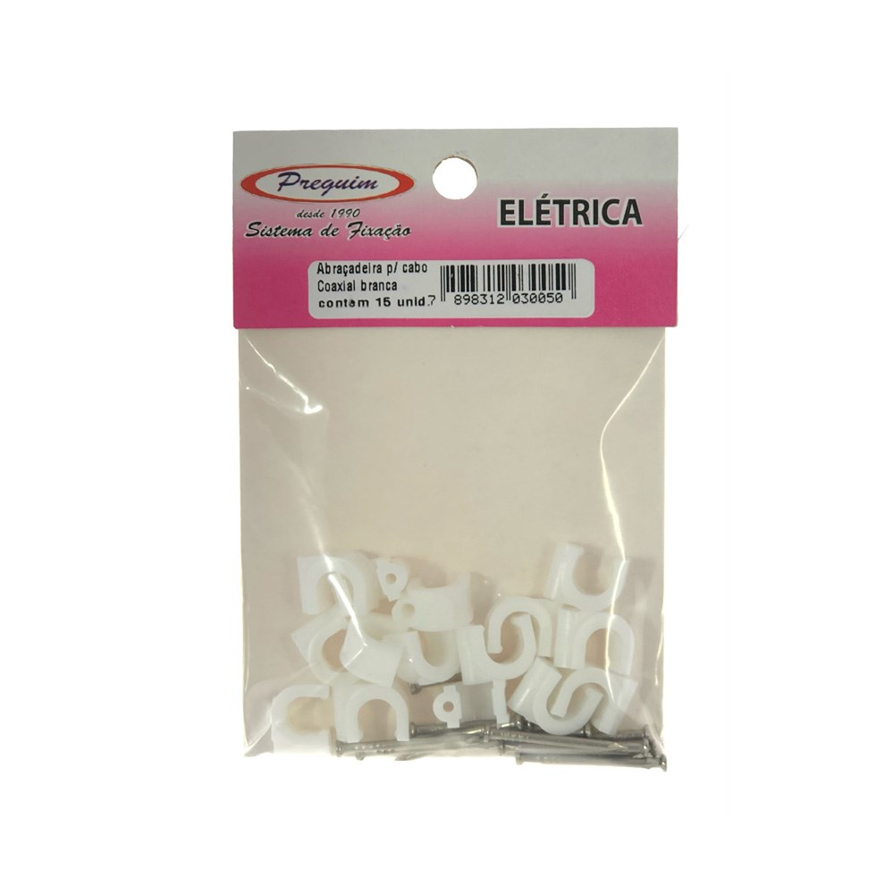 Cartela grampo fixa fio tipo garra branco Preguim - Coaxial 07mm com 15 peças