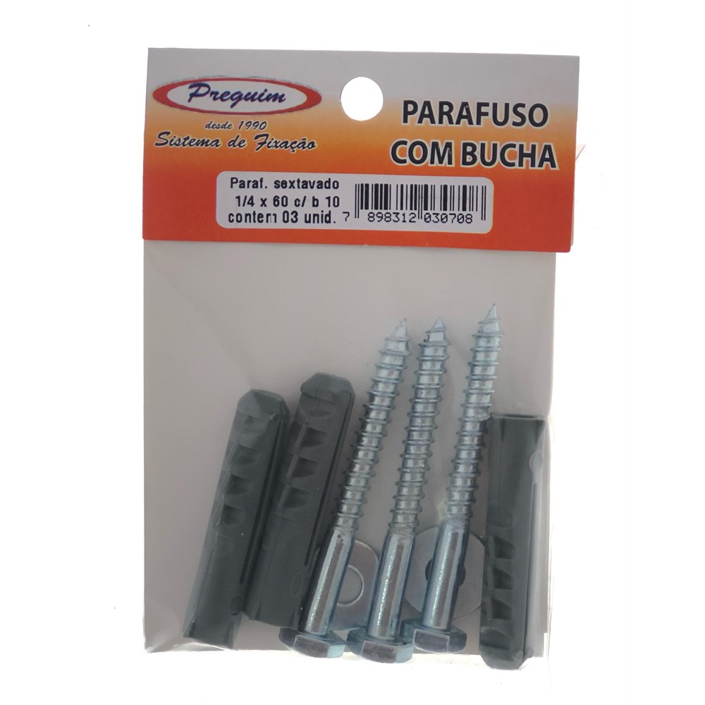 Cartela Parafuso Madeira Preguim - Com Bucha 10mm Sextavado com 03 Peças - 0708