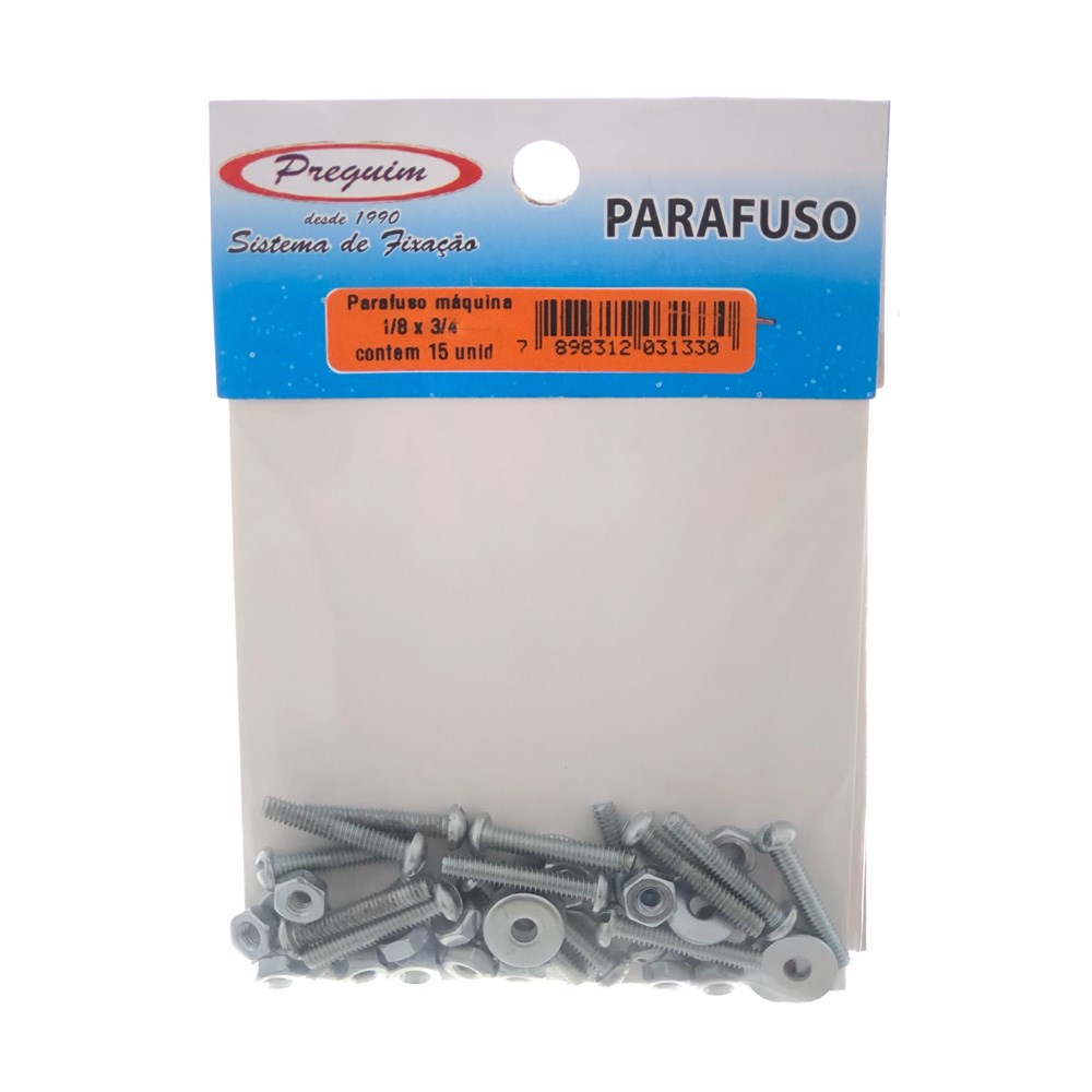 Cartela Parafuso Rosca Máquina Preguim (A) Redonda 1/8 X 3/4+PORCA+ARRUELA com 15 Peças 1330
