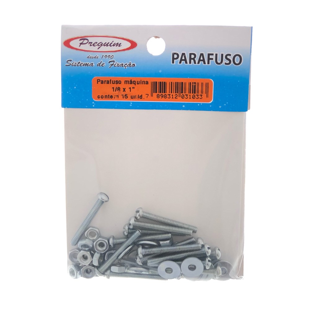 Cartela Parafuso Rosca Máquina Preguim (B) Redonda 1/8 X 1+PORCA+ARRUELA com 15 Peças 1033
