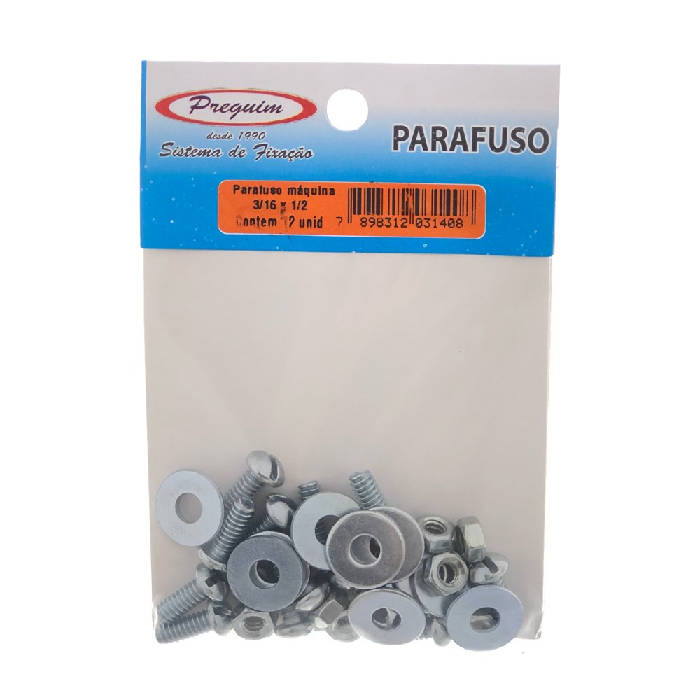 Cartela Parafuso Rosca Máquina Preguim (G) Redonda 3/16 X 1/2+PORCA+ARRUELA com 12 Peças 1408