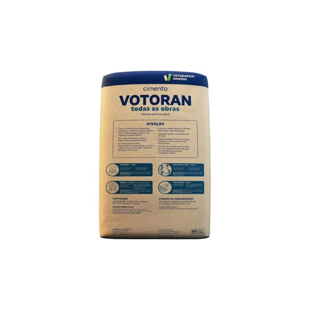 O Cimento Todas as Obras CPII E-32 Votoran 50kg é indicado para aplicações gerais na construção civil, oferecendo excelente desempenho, resistência e versatilidade. Ideal para o preparo de concretos, argamassas, rebocos, contrapiso e assentamentos, atende com eficiência obras residenciais e comerciais, tanto em construções novas quanto em reformas. Sua formulação garante boa trabalhabilidade e resultados consistentes em diferentes etapas da obra.