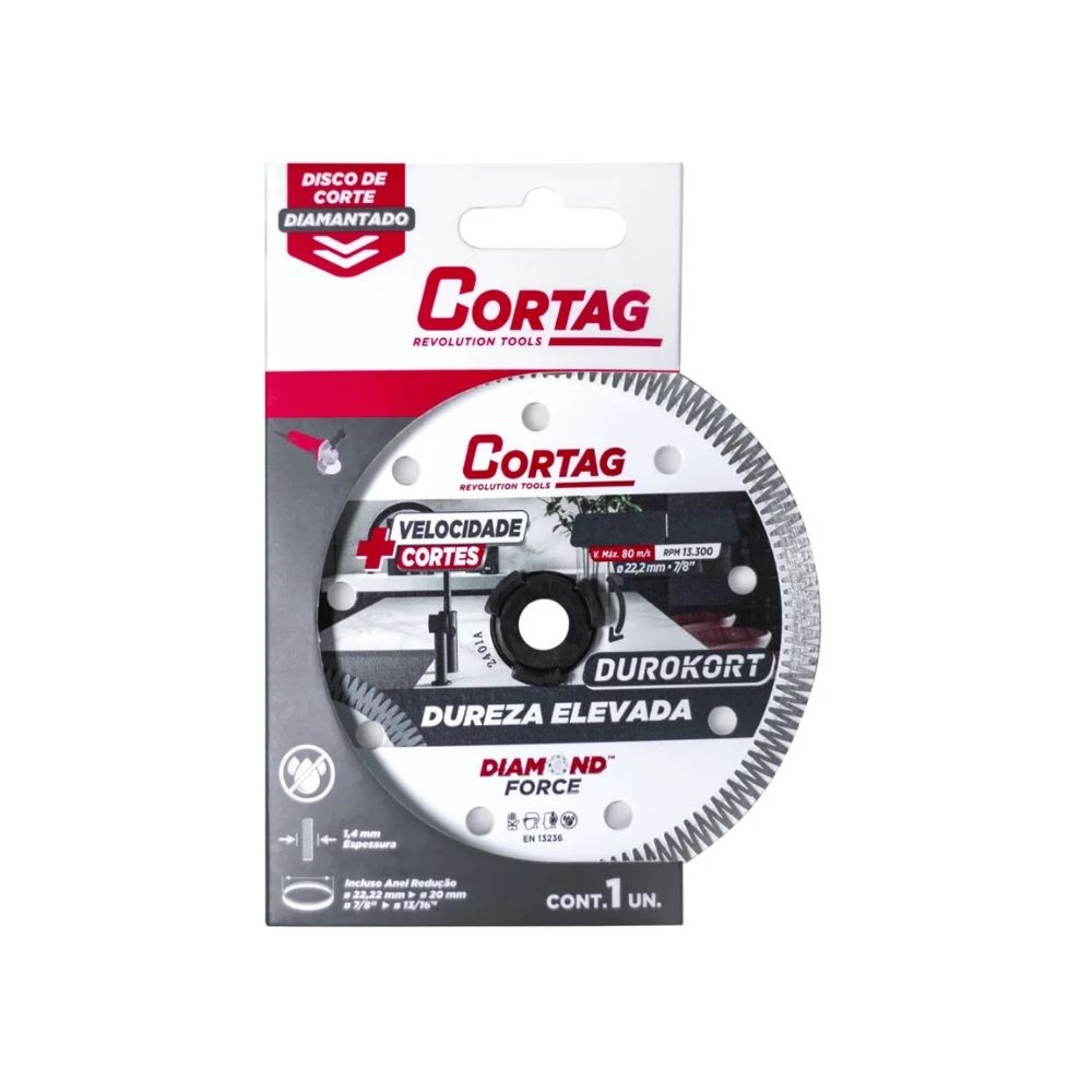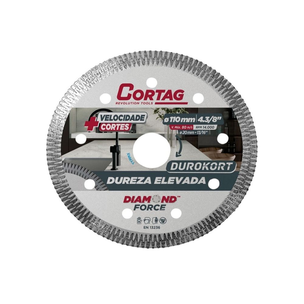 O Disco Diamantado Cortag Turbo Durokort 110 mm é indicado para cortes de alto desempenho em materiais de alta dureza, como concreto, granito, pedras e alvenaria. Sua borda turbo garante cortes rápidos, precisos e com excelente acabamento, sendo ideal para uso profissional em obras e reformas.