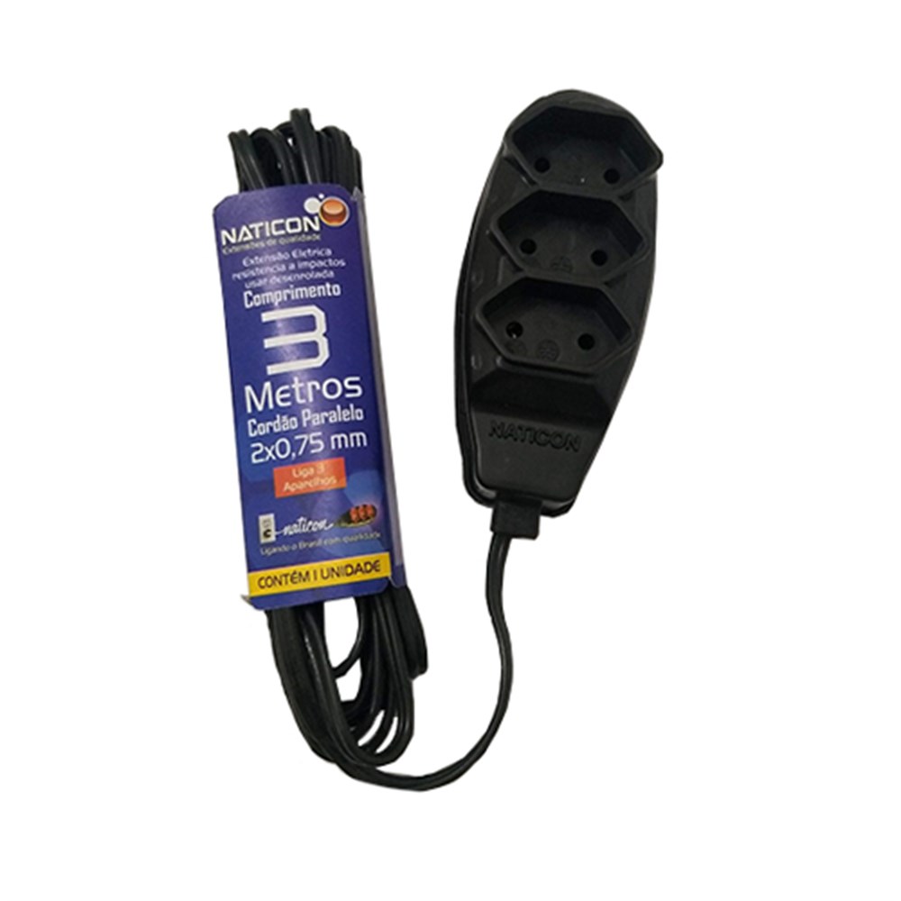 A Extensão Naticon Tripla Paralela 2x0,75 Preta 3m é a escolha perfeita para quem busca praticidade, segurança e eficiência na distribuição de energia. Garanta já a sua e simplifique o seu dia a dia!