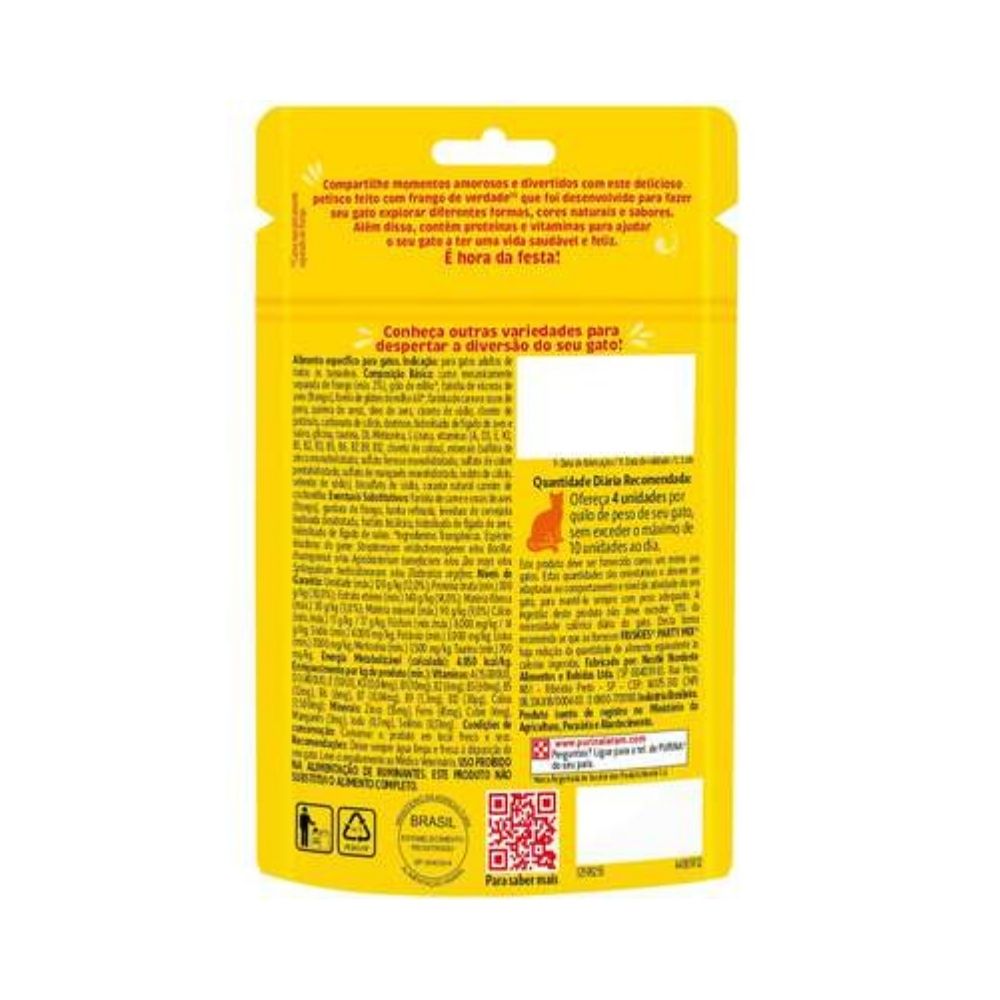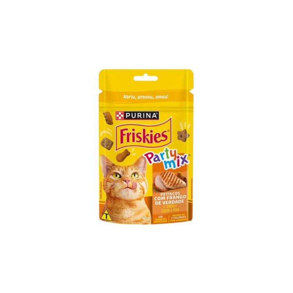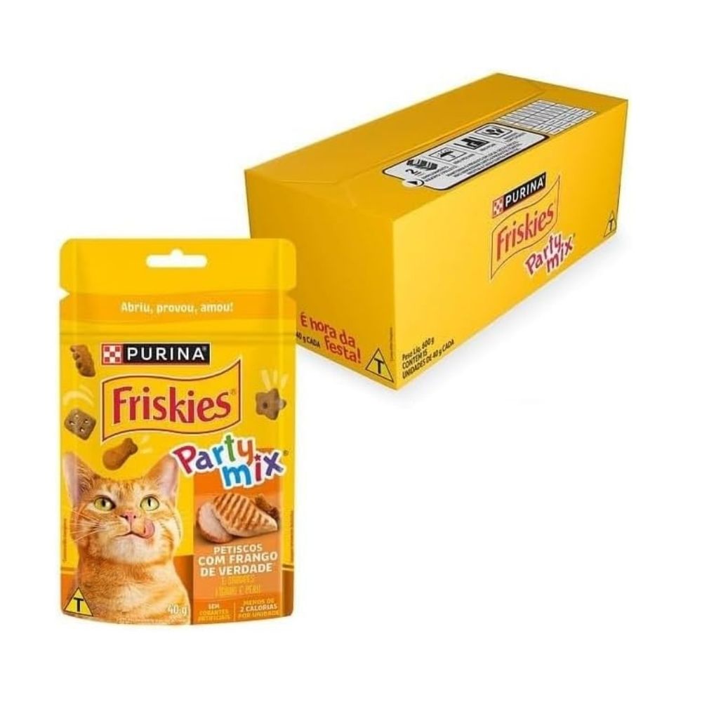 Garanta já o Friskies Party Mix Frango 40g com caixa de 15 unidades e proporcione ao seu gato momentos ainda mais saborosos e divertidos!