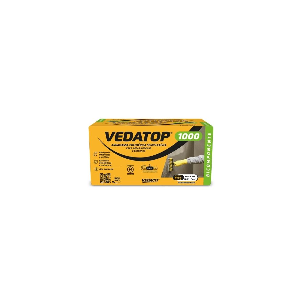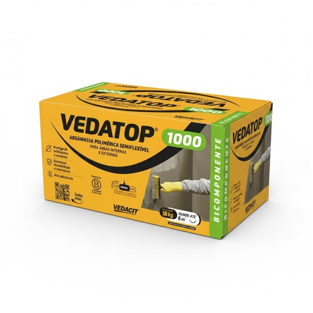 O Impermeabilizante Vedacit Vedatop 1000 é um revestimento rígido de alta performance, indicado para impermeabilizar superfícies sujeitas à umidade e infiltrações. Formulado à base de cimento e aditivos especiais, cria uma barreira protetora resistente à pressão positiva e negativa da água. Ideal para aplicações em lajes, reservatórios, caixas d’água, piscinas e paredes de subsolos, o Vedatop 1000 oferece excelente aderência, fácil aplicação e longa durabilidade, garantindo máxima proteção às estruturas.