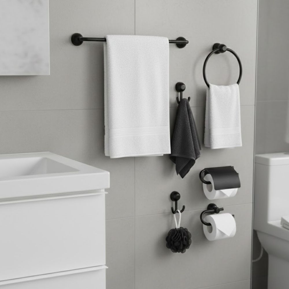 Garanta já o Kit de Acessórios para Banheiro Japi Preto 5 Peças e deixe seu banheiro mais organizado, funcional e com estilo moderno.