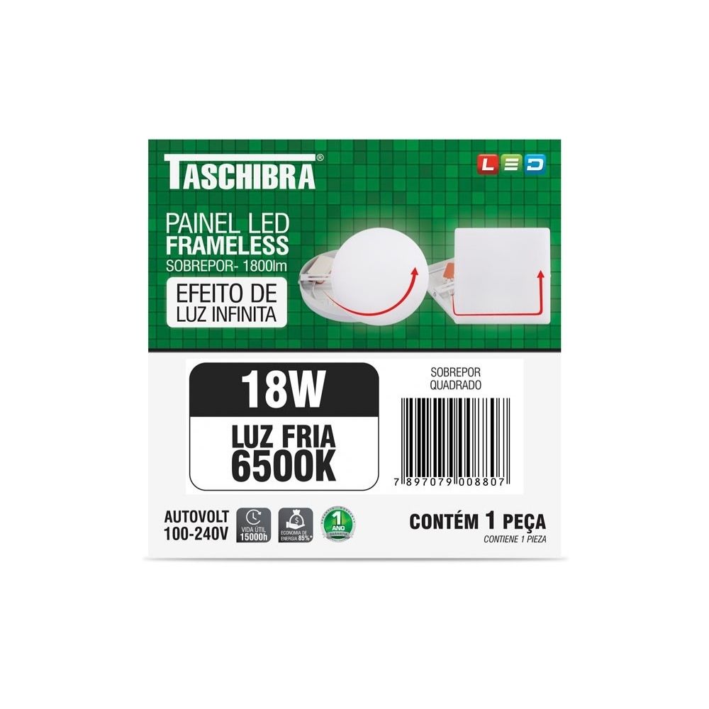 O Painel LED 18W Frameless Sobrepor 6500K Taschibra alia modernidade, economia e praticidade em um único produto. Seu design sem moldura garante um acabamento discreto e sofisticado, enquanto a luz branca fria (6500K) oferece alta luminosidade, ideal para ambientes que exigem mais clareza.