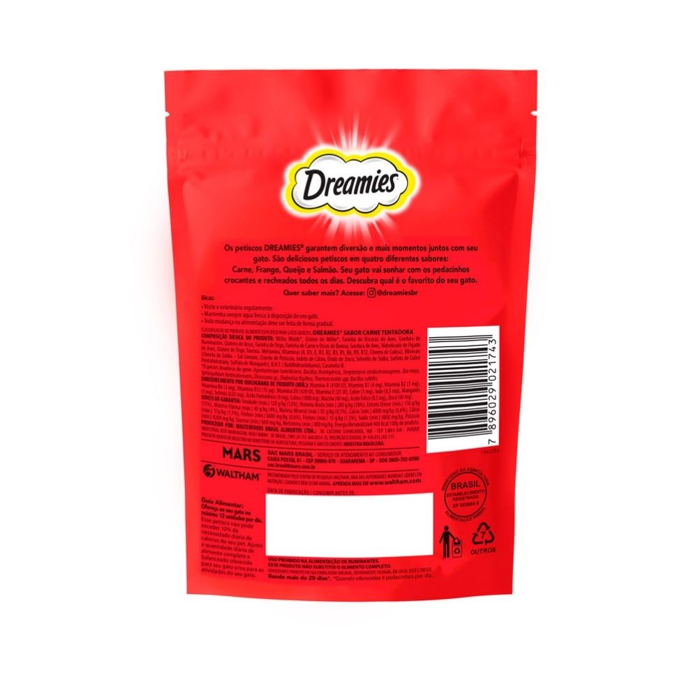 O Petisco para Gatos Adultos Dreamies Sabor Carne 80g combina crocância por fora e recheio cremoso por dentro, oferecendo uma experiência irresistível para felinos adultos. Com sabor marcante de carne e alta palatabilidade, é ideal para recompensas, agrados diários ou reforço positivo durante o treinamento. Sua formulação é pensada para agradar até os gatos mais exigentes, proporcionando momentos de sabor, diversão e interação com o tutor.