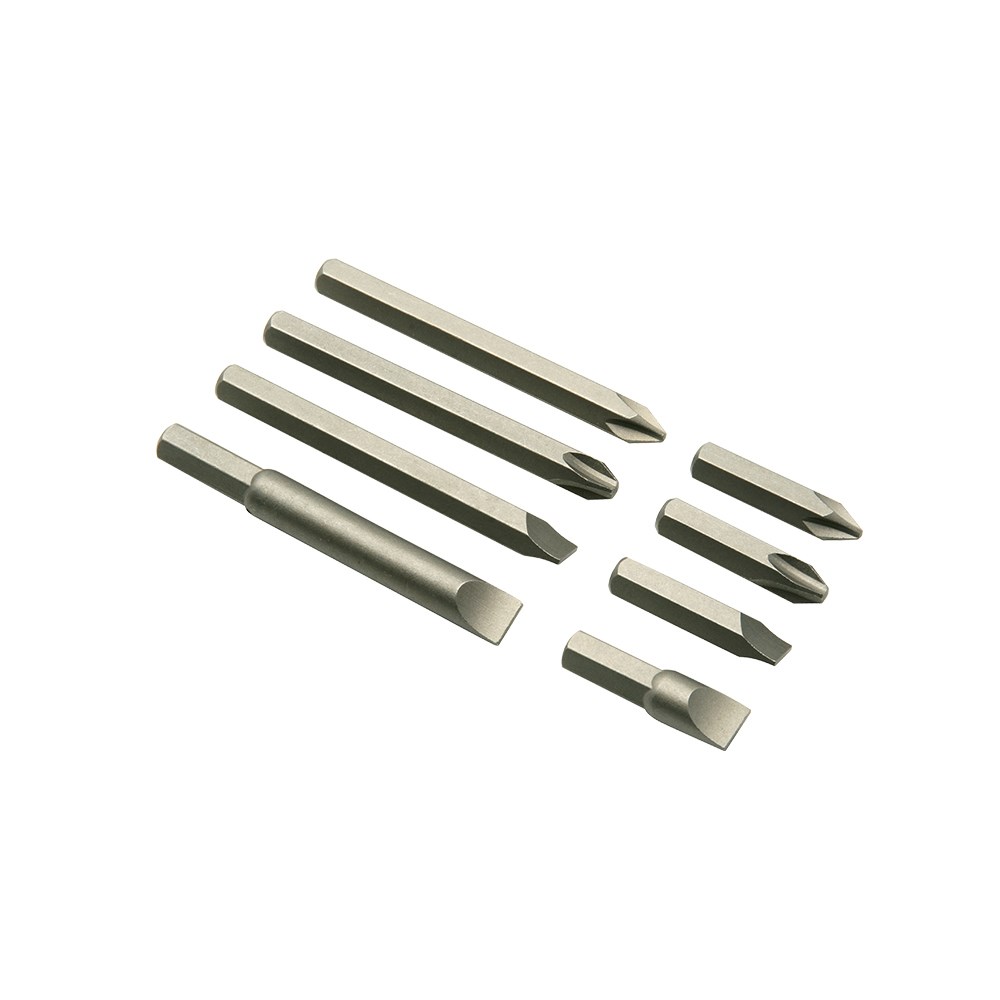1. Conjunto com 8 peças, incluindo ponteiras de fenda e Phillips.