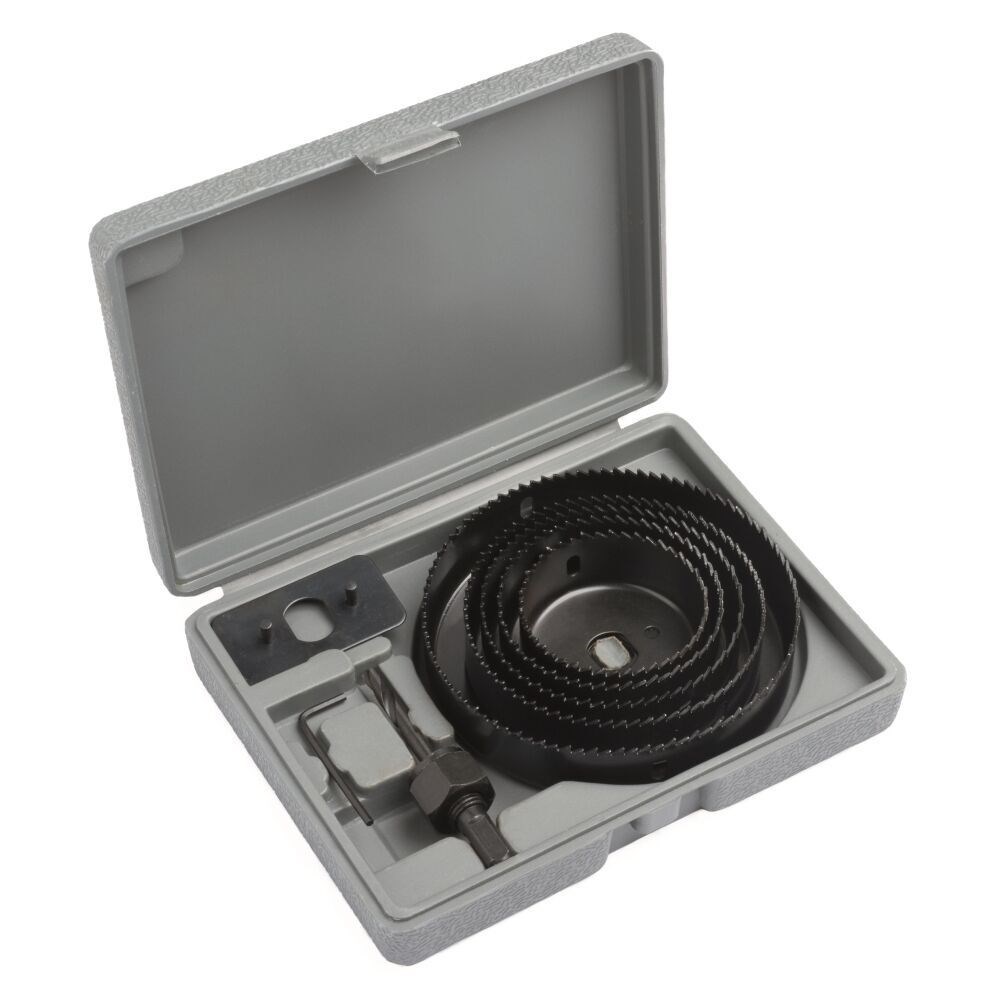 1. Conjunto de 7 peças de serra copo de aço carbono.