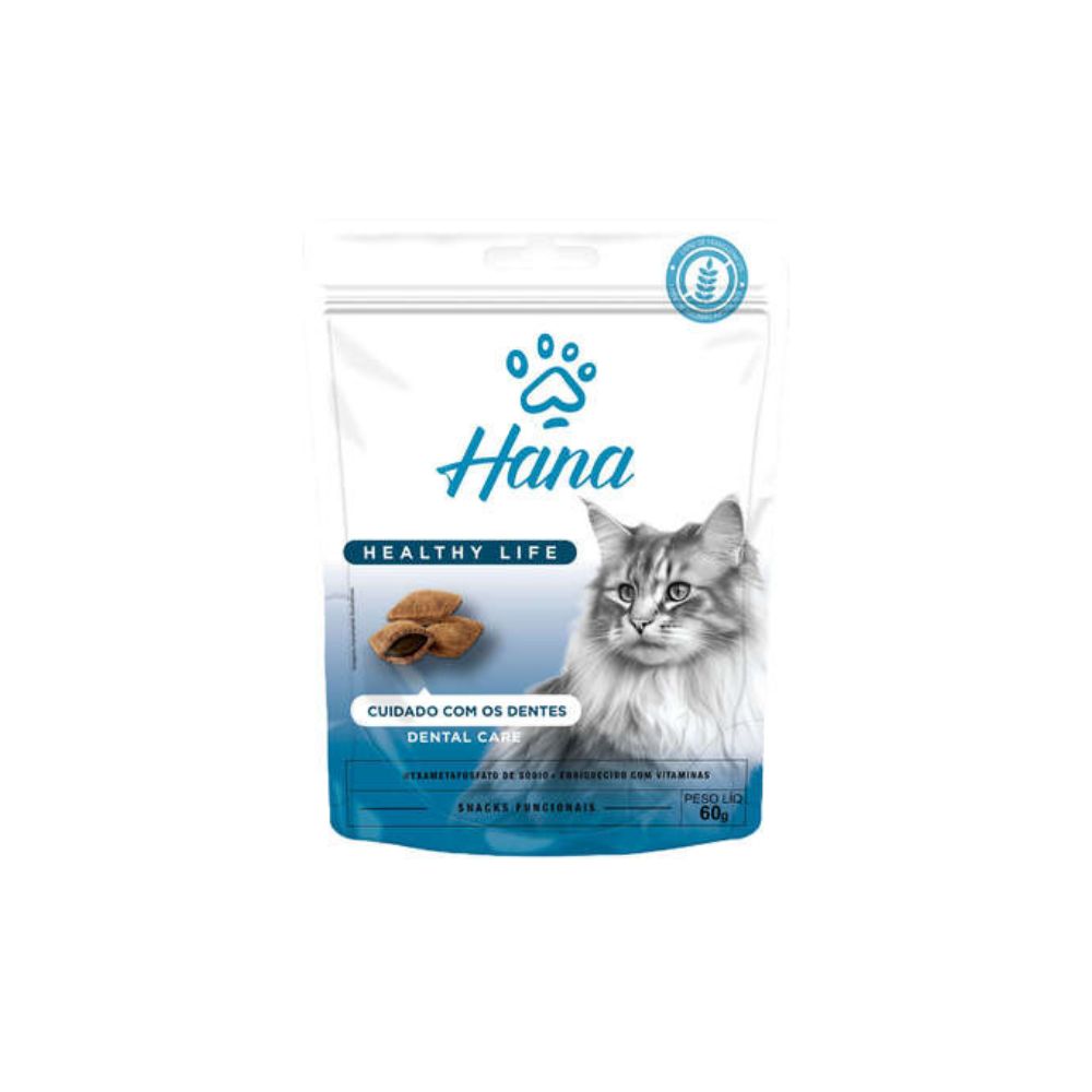O Snack para Gatos Adultos Hana Healthy Life Dental Care 60g foi formulado para auxiliar na saúde bucal dos felinos, oferecendo um petisco saboroso que contribui para a redução do acúmulo de tártaro. Com textura crocante e ingredientes selecionados, ajuda na limpeza mecânica dos dentes durante a mastigação. Ideal para uso diário como complemento aos cuidados orais, o snack também serve como agrado, reforço positivo e incentivo para gatos adultos.