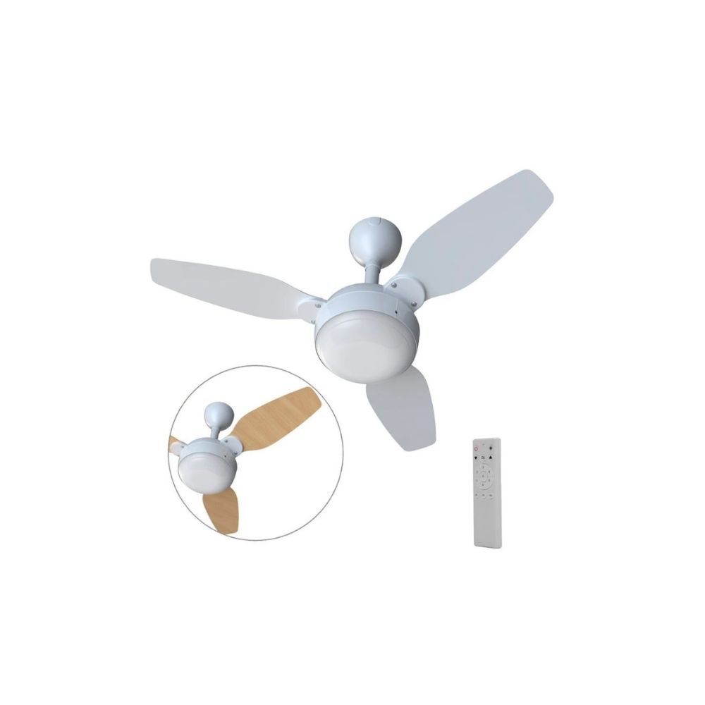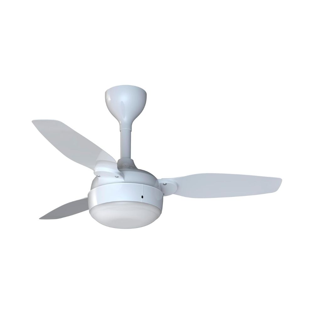 - Design moderno com três pás brancas.
